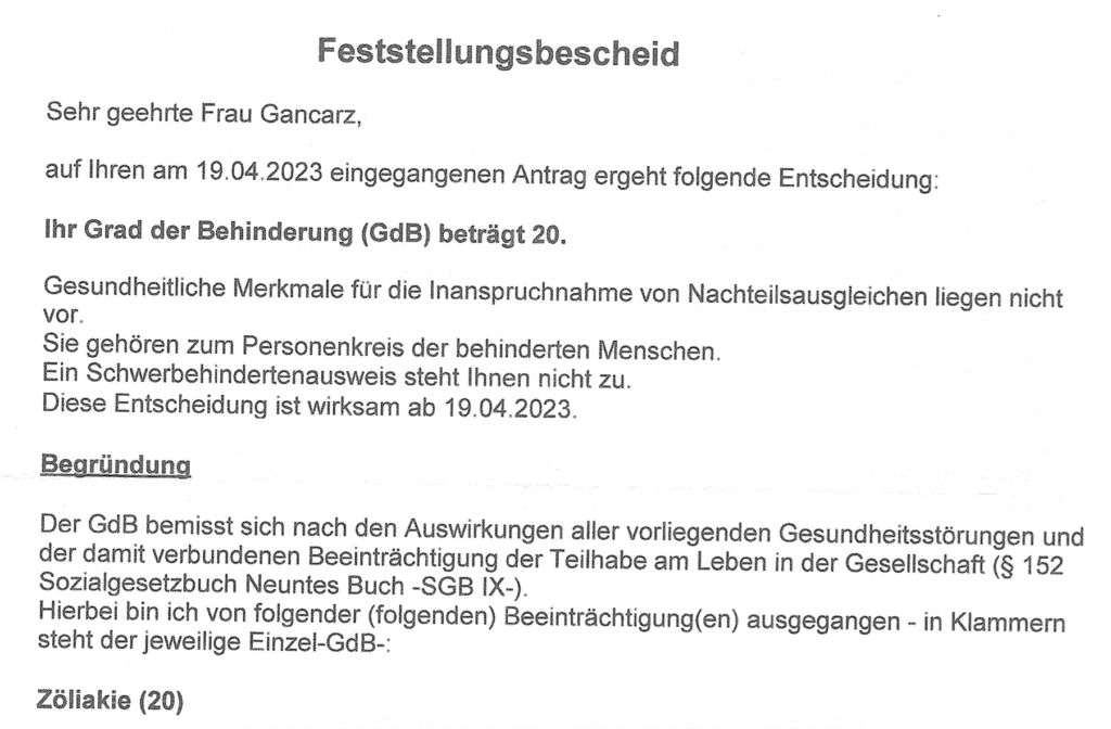 Zöliakie gilt nach dem Sozialgesetzbuch als chronische Erkrankung, die dein Leben dauerhaft beeinträchtigt. Details zur Definition aus dem Sozialgesetzbuch findest du hier bei der DZG. Deshalb kannst du beim Versorgungsamt einen sogenannten Grad der Behinderung (GdB) beantragen.